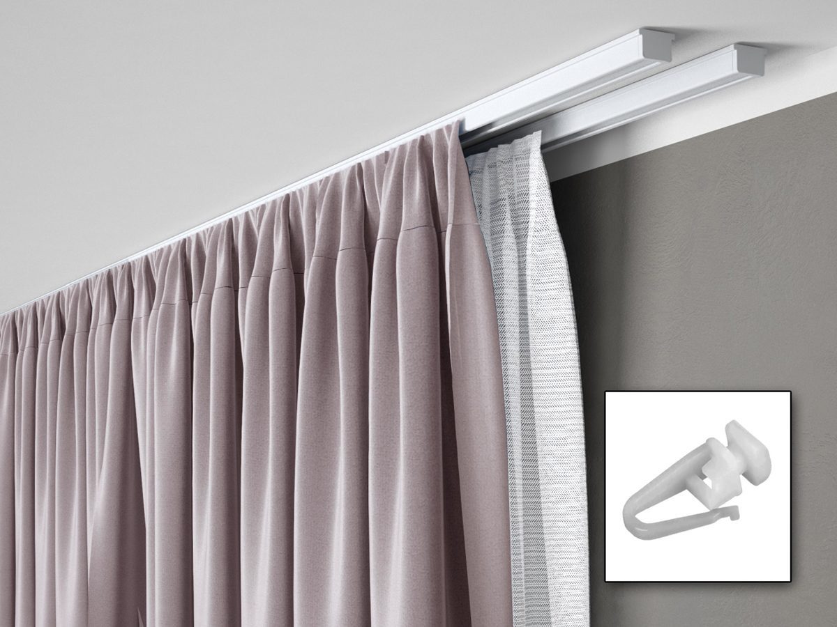 Zestaw karniszowy D250 z agrafkami obejmuje dwie szyny o długości 250 cm każda, wraz z kompletem niezbędnych akcesoriów do instalacji. Aluminiowe profile pokryte proszkową warstwą białego koloru stanowią minimalistyczny i elegancki dodatek. Jeśli twój projekt wymaga ukrycia karnisza, możesz skorzystać z dostępnej w różnych wzorach listwy karniszowej Mardom Decor.
