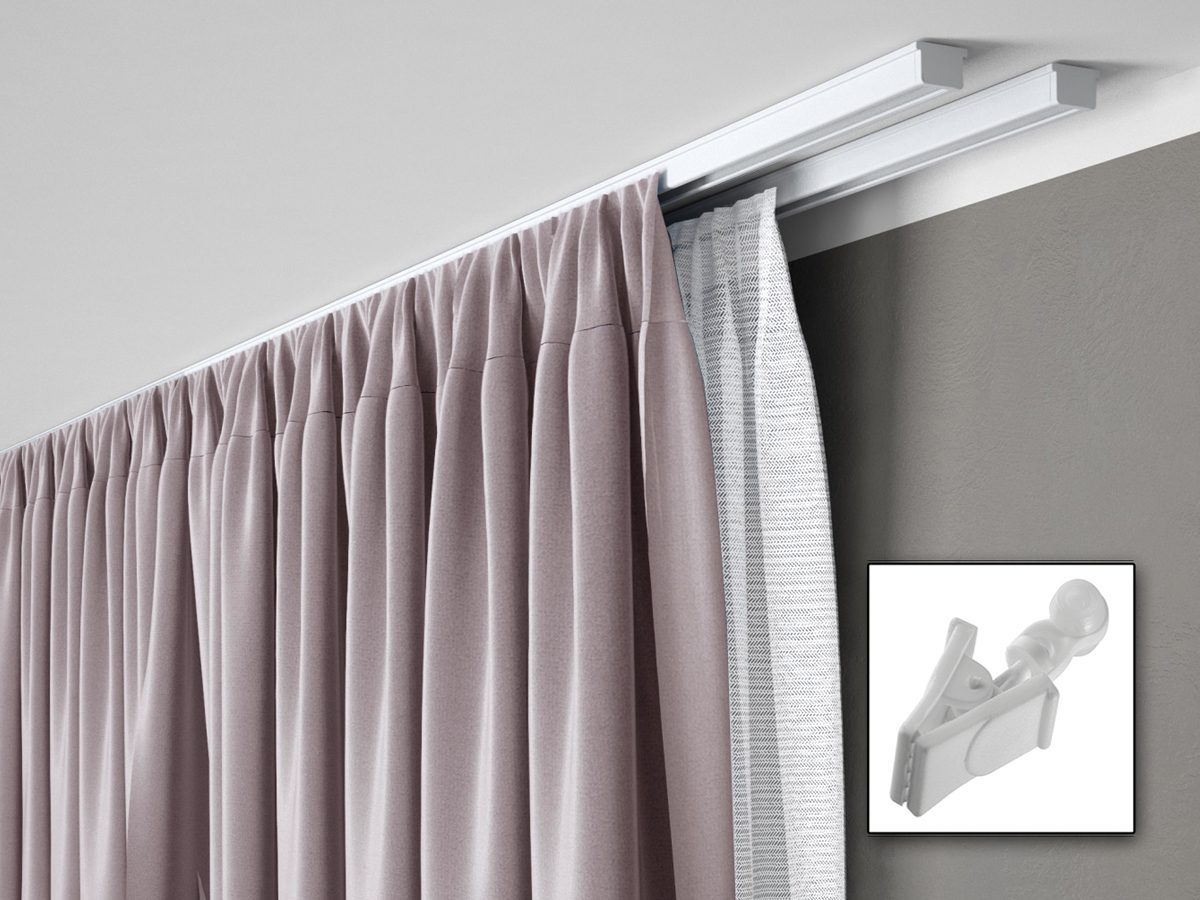 Zestaw karniszowy D250 z żabkami obejmuje dwie szyny o długości 250 cm każda, wraz z kompletem niezbędnych akcesoriów do instalacji. Aluminiowe profile pokryte proszkową warstwą białego koloru stanowią minimalistyczny i elegancki dodatek. Jeśli twój projekt wymaga ukrycia karnisza, możesz skorzystać z dostępnej w różnych wzorach listwy karniszowej Mardom Decor.