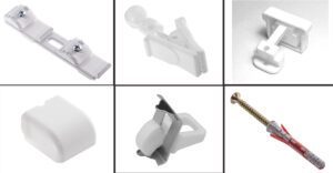 • 2 sztuki blokady szyn, które zapobiegają przypadkowemu suwaniu się tkanin na karniszach