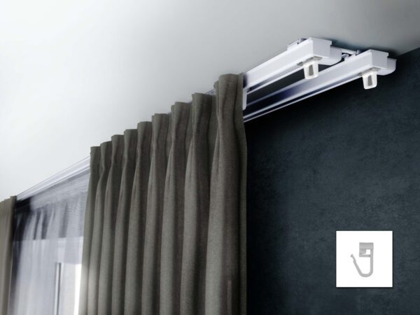 Profesjonalny i funkcjonalny system do zawieszania średnio-ciężkich tkanin. Montaż szyny na suficie jest szybki i prosty (wkręcane kołki mocujące w zestawie). Wytrzymałe wciskane suwaki – odporne na promieniowanie UV. Szyny można łączyć ze sobą w dłuższe odcinki za pomocą łączników ZS . Do jednego połączenia dwóch zestawów podwójnych ZS2 niezbędne są dwa łączniki.