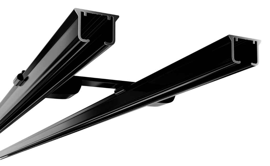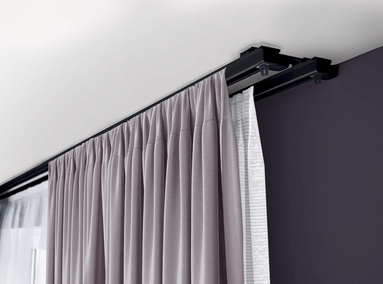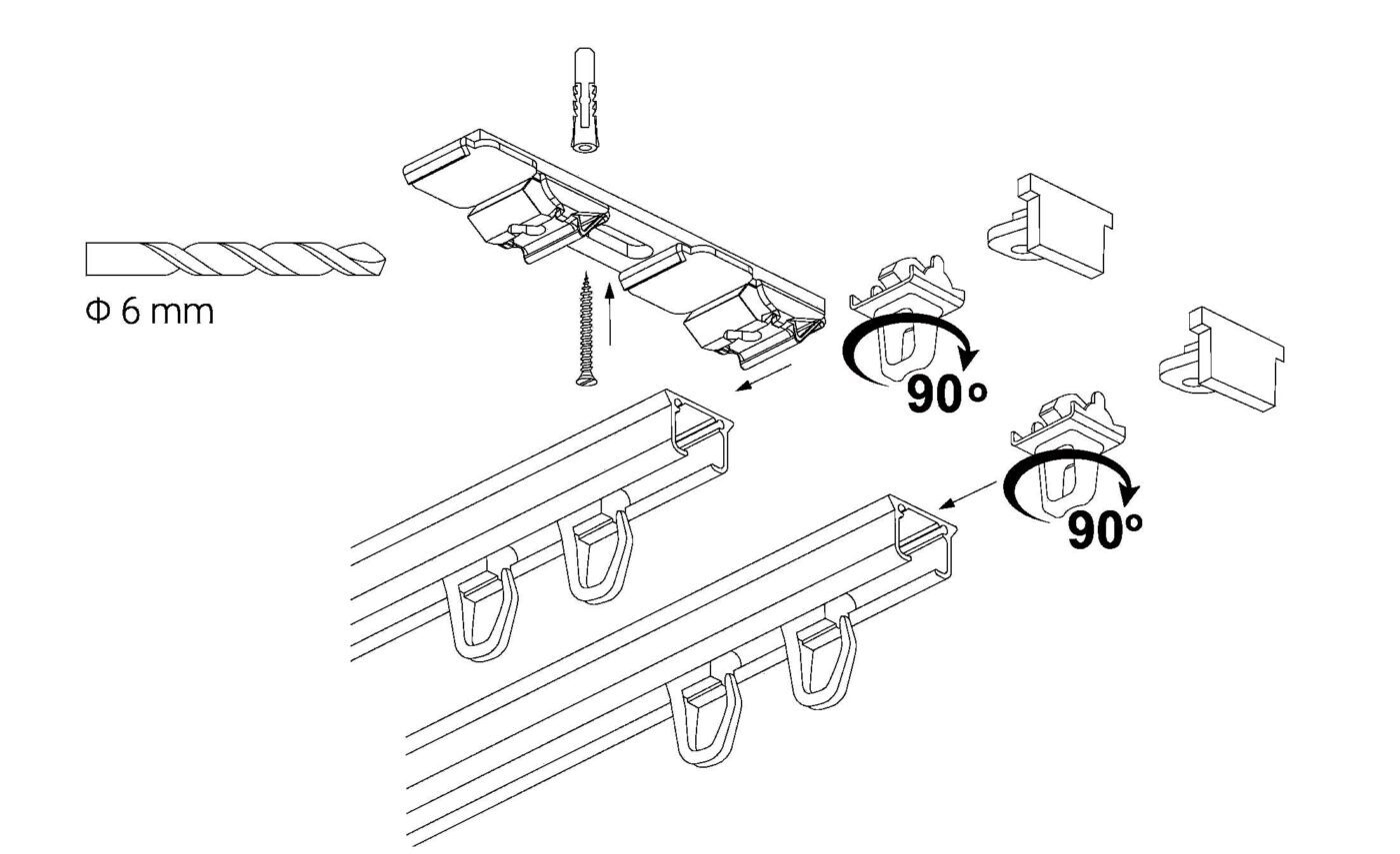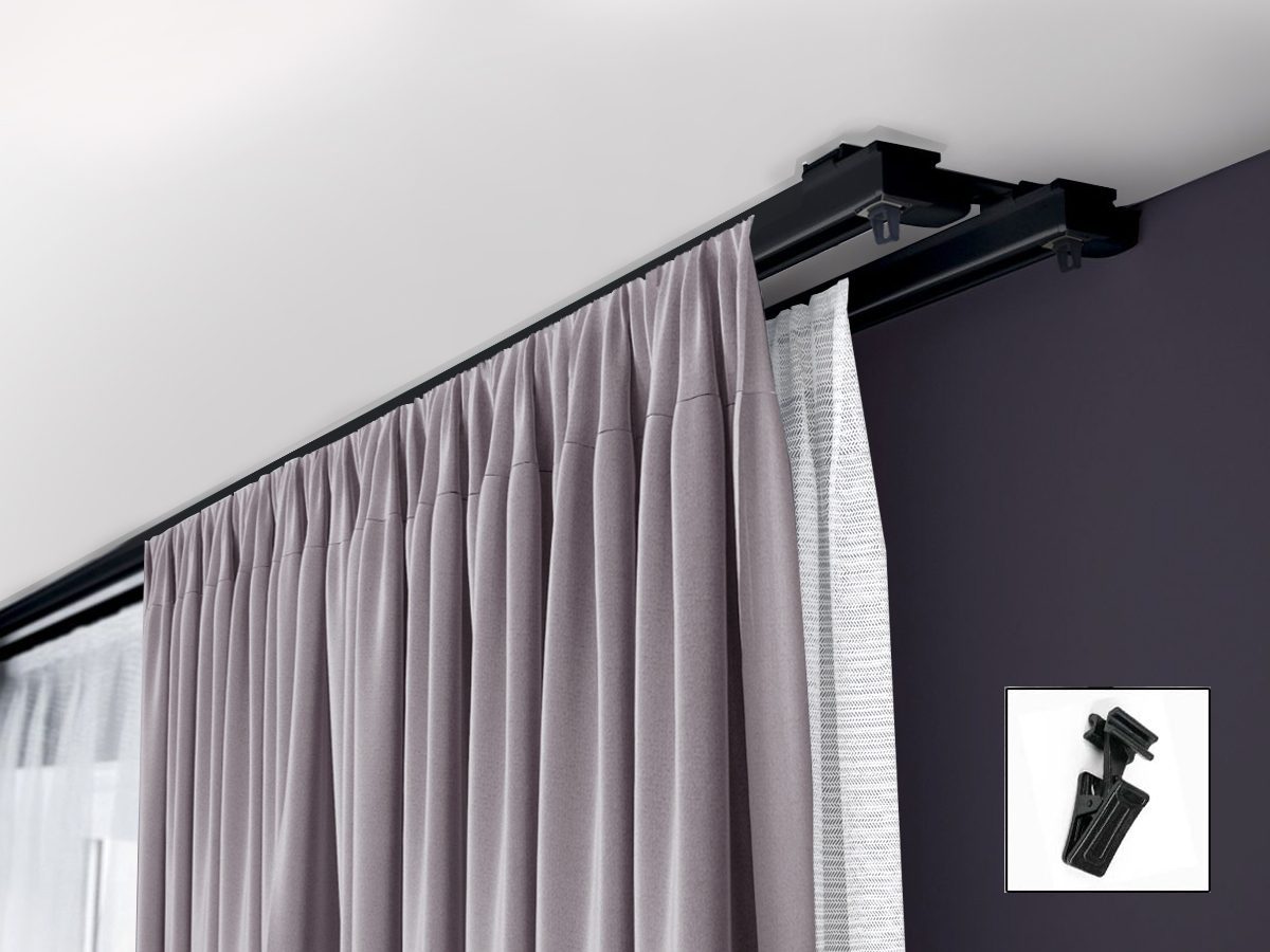 Profesjonalny i funkcjonalny system do zawieszania średnio-ciężkich tkanin. Montaż szyny na suficie jest szybki i prosty (wkręcane kołki mocujące w zestawie). Wytrzymałe wciskane suwaki – odporne na promieniowanie UV. Szyny można łączyć ze sobą w dłuższe odcinki za pomocą łączników ZS . Do jednego połączenia dwóch zestawów podwójnych ZS2 niezbędne są dwa łączniki. W ofercie posiadamy zestawy podwójne i pojedyncze z agrafką, żabką i oczkiem flex.